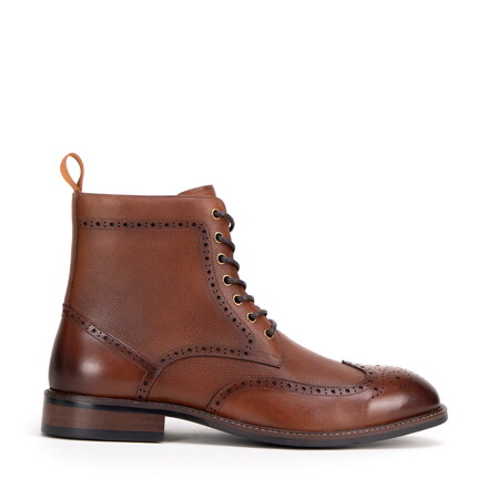 Oto buty, które łączą w sobie elegancję i komfort dzięki najwyższej jakości materiałom i solidnej konstrukcji. Męskie trzewiki zostały wykonane z wysokiej jakości licowej skóry naturalnej, co gwarantuje nie tylko estetyczny wygląd, ale także trwałość na lata. Płaski obcas zapewnia stabilność i komfort użytkowania, podczas gdy solidna gumowa podeszwa z antypoślizgowymi elementami zapewnia doskonałą trakcję. Klasyczne sznurowanie umożliwia idealne dopasowanie, a subtelnie wykonane perforacje dodają lekkości i przewiewności, tworząc spójny i kreatywny styl.