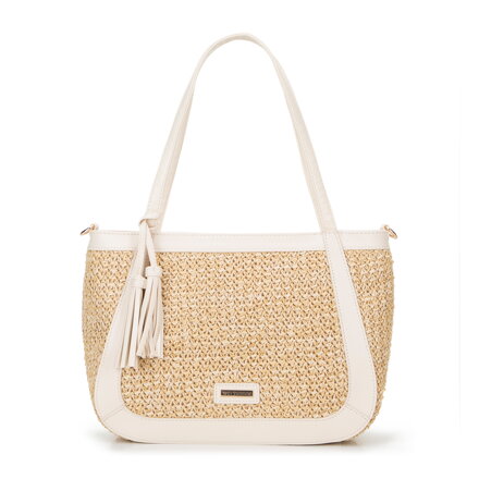 Táto elegantná kabelka na rameno s originálnou pletenou štruktúrou je ideálnou voľbou na letné dni. Vyrobená z kombinácie matnej ekokože a dekoratívnej pleteniny, má spevnený, mierne zaoblený tvar, ktorý spája štýl a funkčnosť. Napriek menším rozmerom do nej bez problémov uložíš peňaženku, malú kozmetickú taštičku, fľašu s vodou a ďalšie drobnosti.