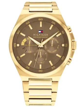 Elegantné a moderné pánske hodinky Tommy Hilfiger DEXTER 1792090 sú ideálnym doplnkom na každodenné nosenie. Púzdro a náramok sú vyrobené z kvalitnej nehrdzavejúcej ocele 316L, ktorá je odolná voči korózii a hypoalergénna. Zlaté prevedenie dodáva hodinkám luxusný vzhľad. Hnedý ciferník so slnečným brúsením je doplnený o tri subciferníky zobrazujúce deň v mesiaci, deň v týždni a 24-hodinový čas. Všetko je chránené minerálnym sklom.